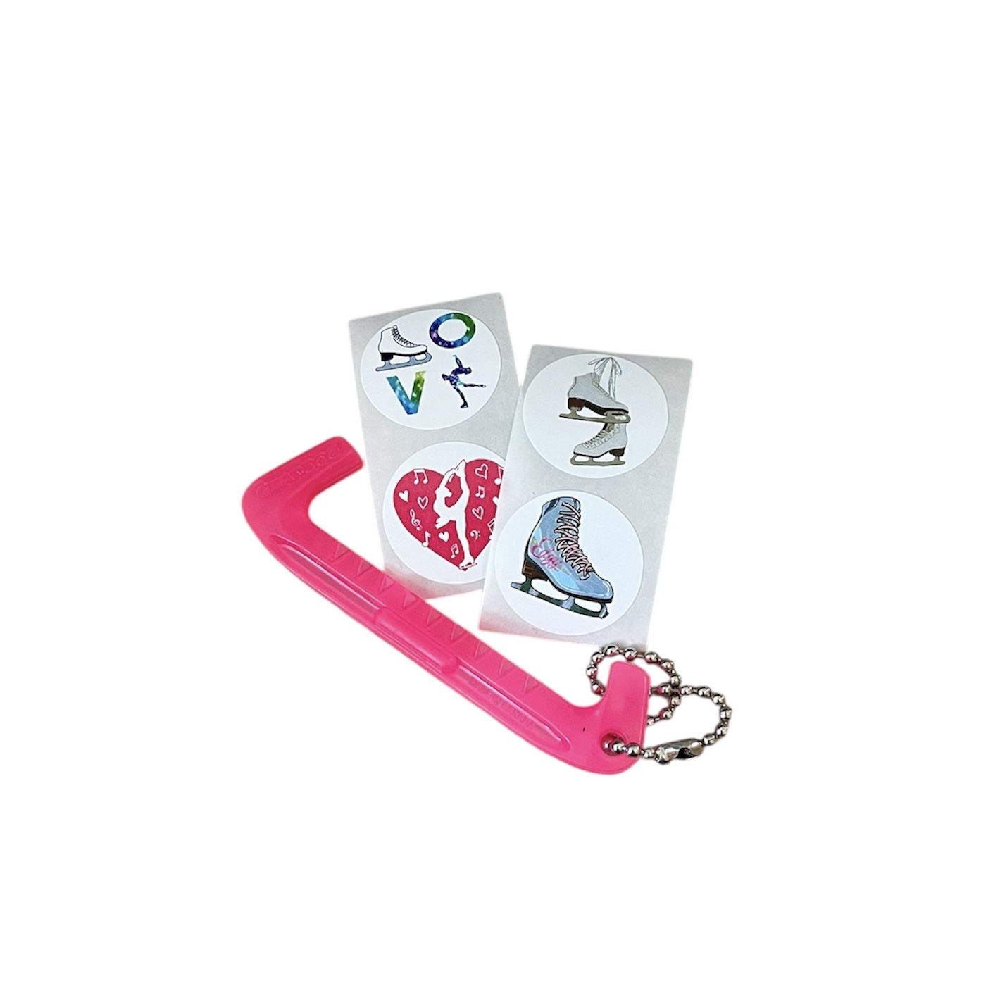 The set includes a plastic blade guard keychain and four skating-themed stickers. A lovely gift, for example, for a Christmas party!