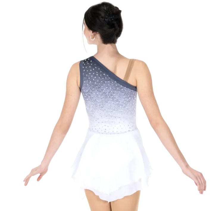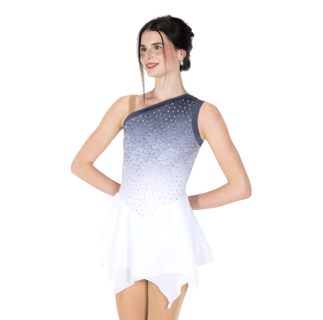 A sophisticated lace dress that blends from storm cloud grey at the shoulder through to shadow silver and then icy white at the waist. A liberal sprinkle of silver glitter adds sparkle to the lace and the skirt is a double layer of snowy georgette. Fully lined in lycra.