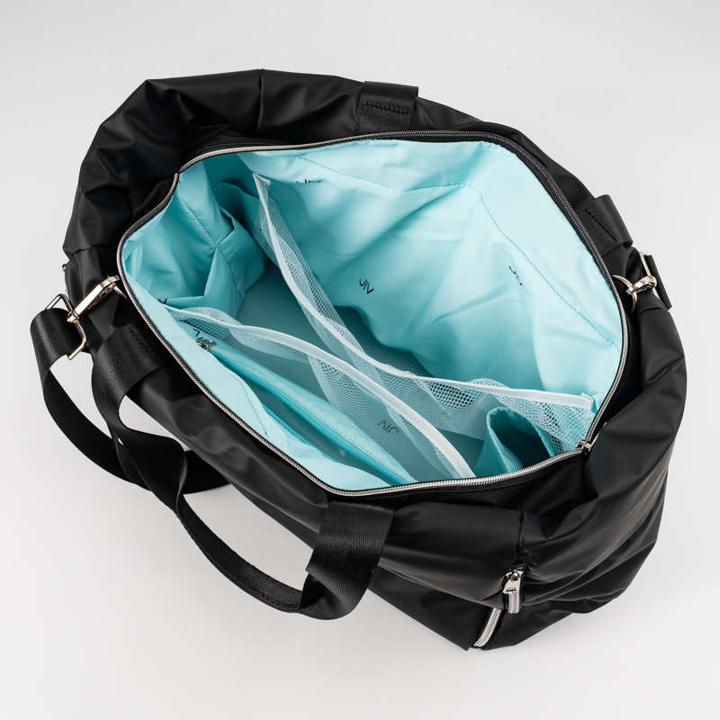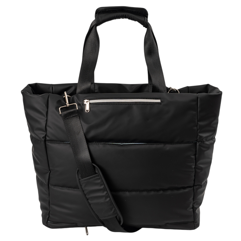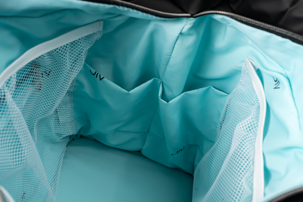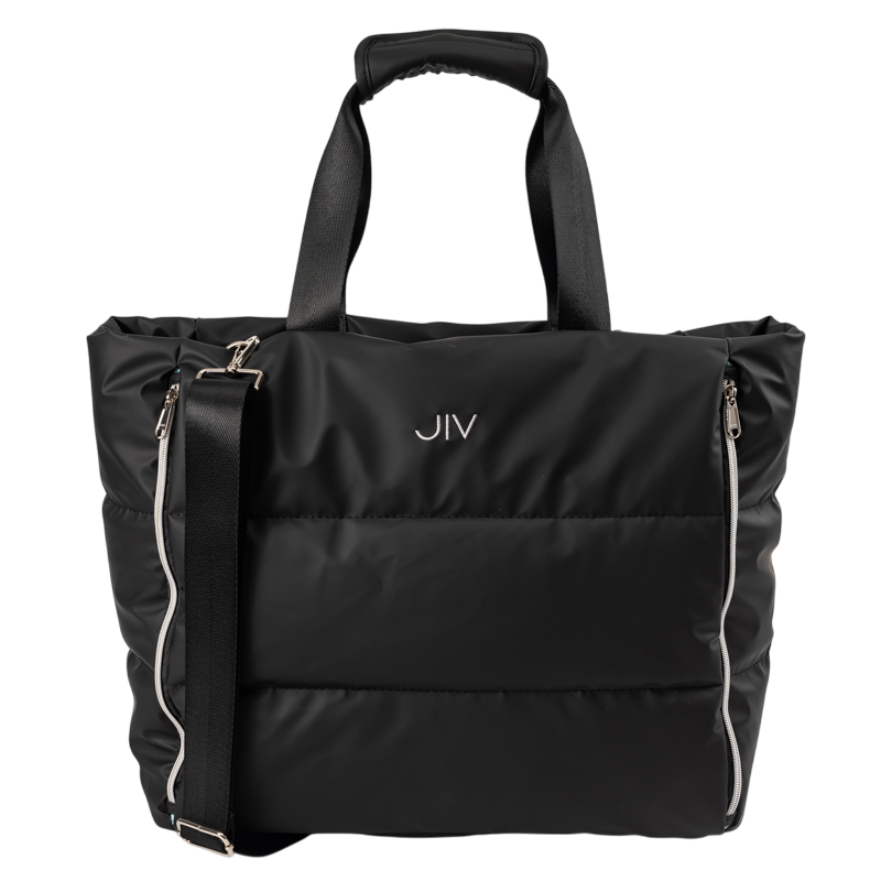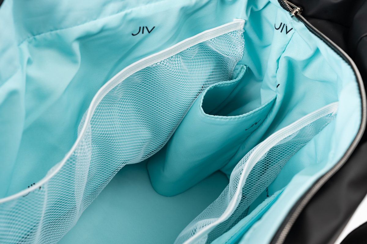 Jiv Black Multi Tote Bag. A versatile and stylish gear bag that fits everything you need. The bag features two mesh pockets for skates, a hard bottom to protect your skates, a convenient bottle holder, multiple zippered pockets, reinforced handles and a shoulder strap, silky-smooth material, and two waterproof pouches for wet items and essential small belongings.