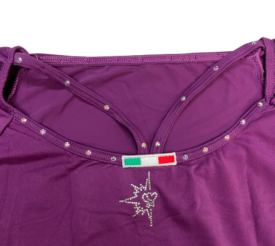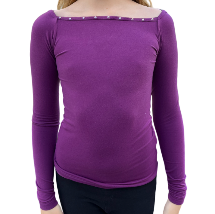 Karisma rhinestone decorated long sleeve. The back has a beautiful detail. Color: Plum.
