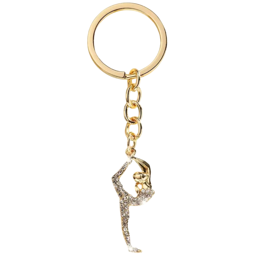 Gold-colored Biellmann keychain decorated with rhinestones, perfect for attaching to keys or a bag.