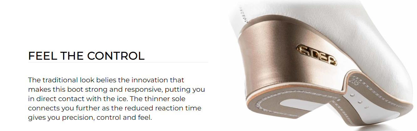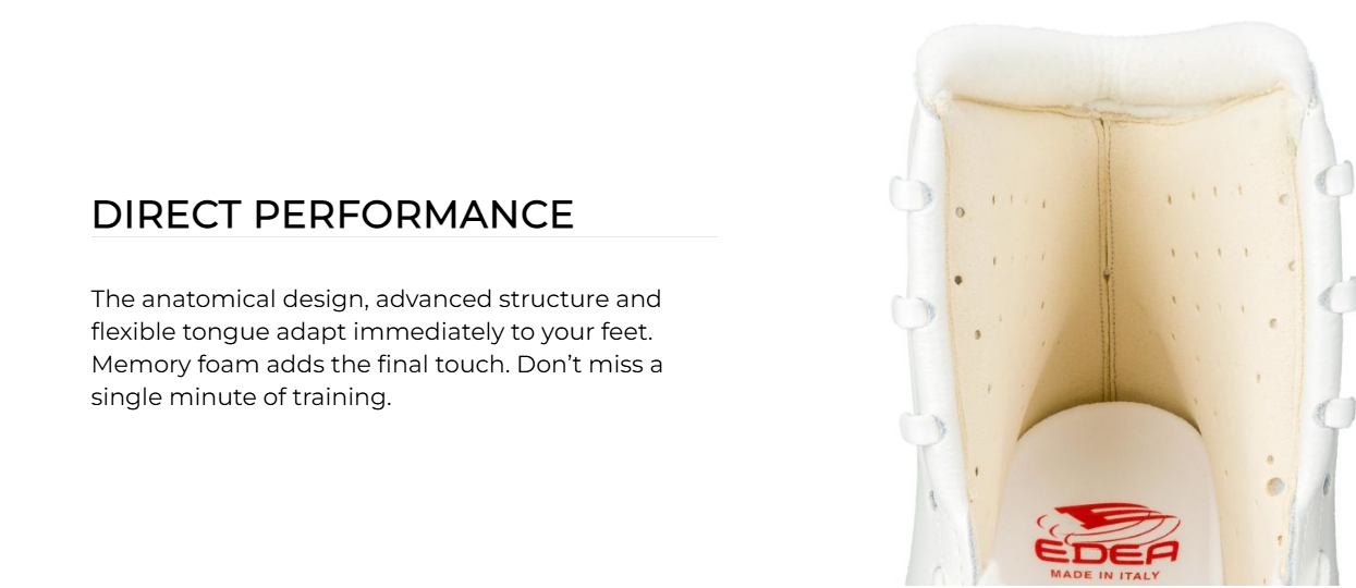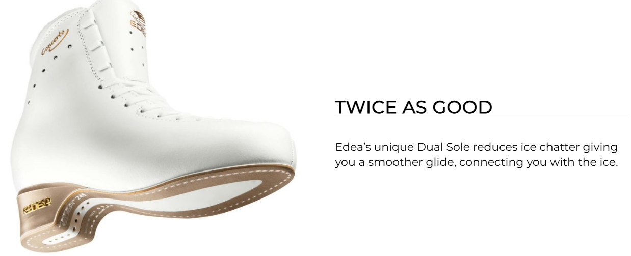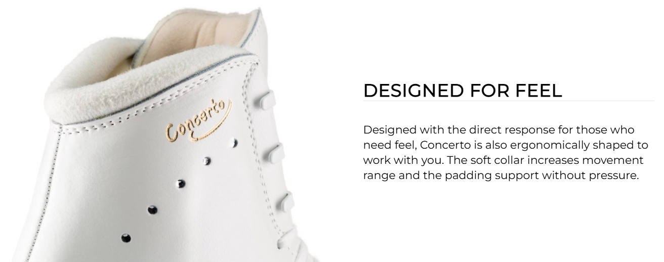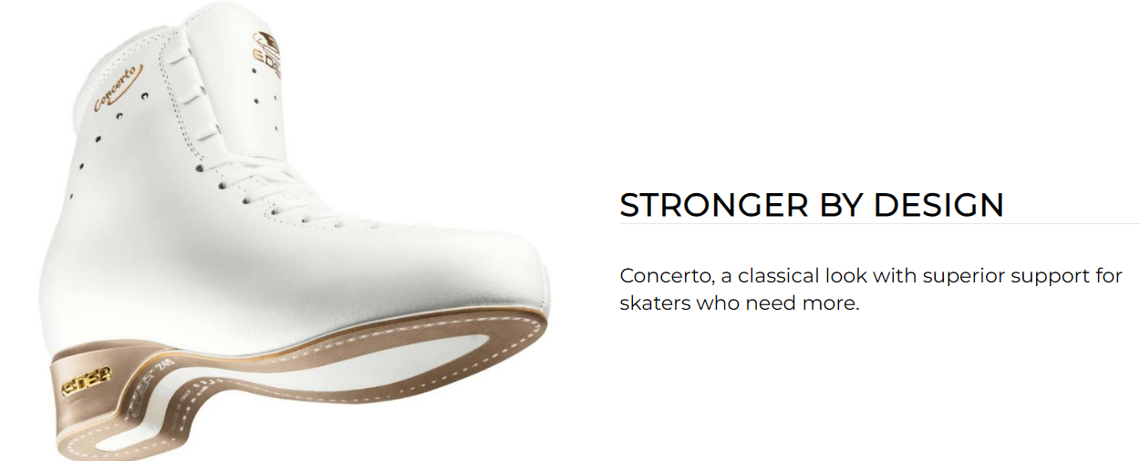 Edea Concerto – taitoluistinkenkä on vaativaan luisteluun, luistin on tarkoitettu ja kolmoishyppyjä harjoitteleville yksinluistelijoille sekä noviisi-, juniori- ja senioritason muodostelmaluistelijoille.