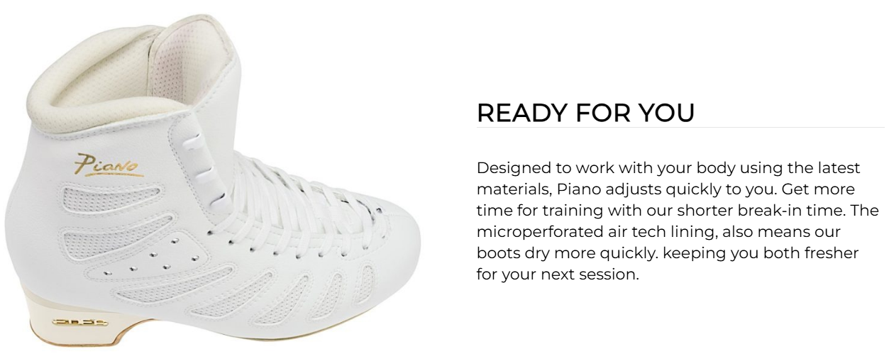 Edea Piano yhdistää keveyden, tukevuuden ja tarkkuuden vaativaan harjoitteluun ja kilpailuun. Edea Piano on tarkoitettu kolmois- ja neloishyppyjä harjoitteleville luistelijoille. Memory foam -sisus mukautuu jalkaan, thermo-muovattava rakenne takaa yksilöllisen istuvuuden, ja kestävä pohja parantaa tasapainoa sekä terätuntumaa. Edea Pianon anti-shock järjestelmä maksimoi iskunvaimennuksen hypyissä.