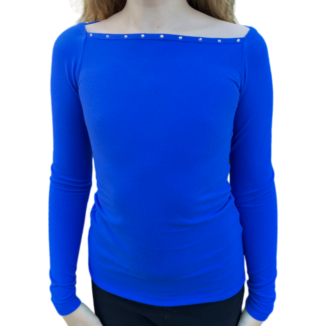 Karisman tyylikäs strassikoristeltu pitkähihainen Titta pusero. Selässä ja pääntiessä kaunis strassattu yksityiskohta. Väri: Sähkön sininen/Cassiopeia. Pusero on kauniin tyköistuva ja pehmeää päällä.