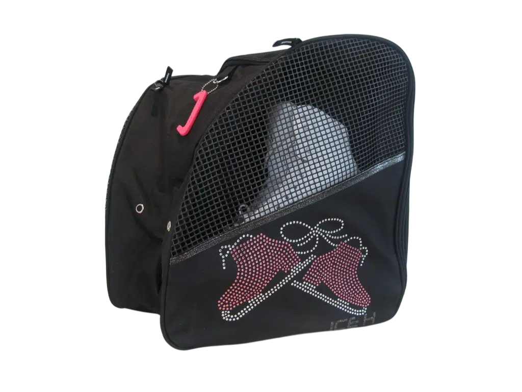 Luistinreppu, jossa molemmilla sivuilla on omat taskut luistimille. Keskellä on tilava säilytysosa muille tavaroille. Repussa on pehmustetut olkahihnat ja ne ovat säädettävissä. Repussa on kaunis strassikoriste molemmilla sivuilla.